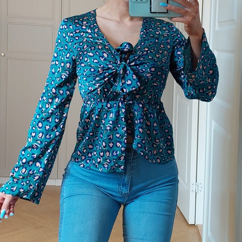 Flot blå bluse med lyserødt mønster fra Boohoo