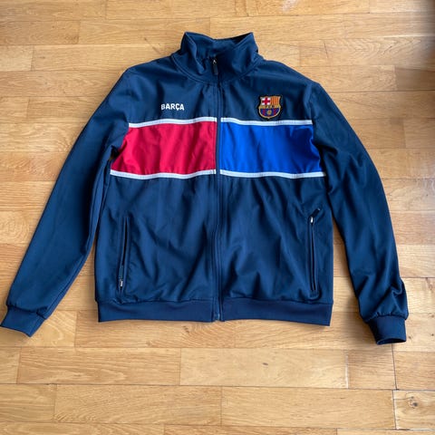 Sportstøj, Jakke/træningsjakke, Nike og FCB, str. 176, Nike træningsjakke i samarbejde med FC Barcelona med to lommer foran og logo foran og bagpå, der dog er lidt slidt, deraf prisen.