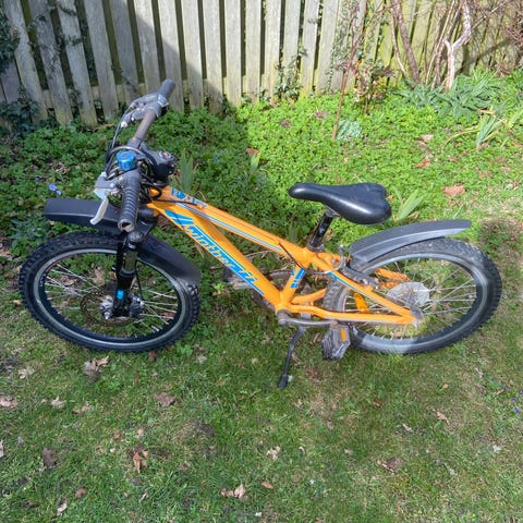 Børn fra 5-7 år kan bruge cyklen. Baghjulet skal lappes, da det er punkteret.