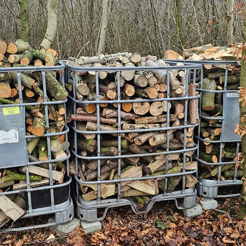 Pakket i pallebure af træ med 1 rummeter i hver, som kan læsses på trailer eller lastbil. Pallebur følger med.