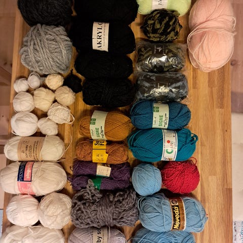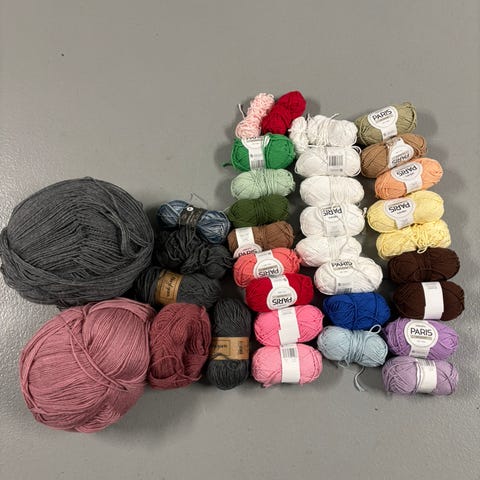 Seks nøgler Phildar, to nøgler Scampi, tre nøgler Chanteleine, tre nøgler Perle-acryl, tre nøgler Saga sælges samlet for 175 kr.