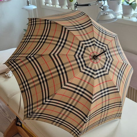 Flot og med alderssvarende brugsmærker og få kosmetiske skønhedspletter. Muligvis en Burberry sol paraply, dog uden varemærke. Udseende og størrelse som fundet på modeller på nettet.