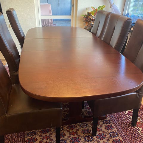 Solidt spisebord mørkt træ i fin stand. Der medfølger to tillægsplader (ej afbilledet) på 40 x 100 cm, så den samlede længde kan blive 280 cm. De ene tillægsplade har misfarvning.