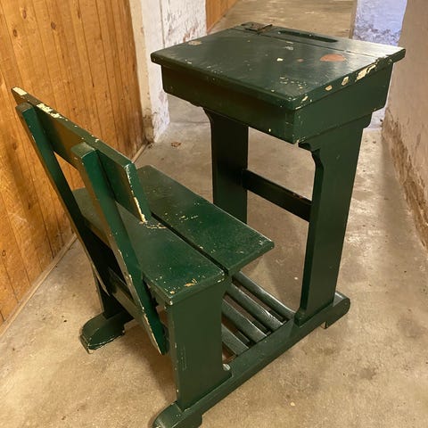 Gammel skolebænk med knage på siden til taske mm. Hul i bordet til blyanter mm.