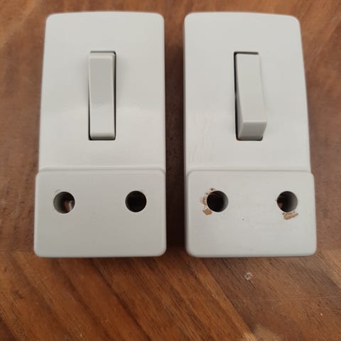 LK gamle typer stikkontakt og afbryder “minitangent”. 3 stk. dobbelt stikkontakt og 1 afbryder komplet med klostykker - sælges for kr. 25/stk. og samlet for kr. 75