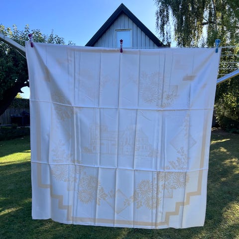 Lyserød / laksefarvet dug. Damaskvævet / drejlvævet (ternet mønster i meget god stand.