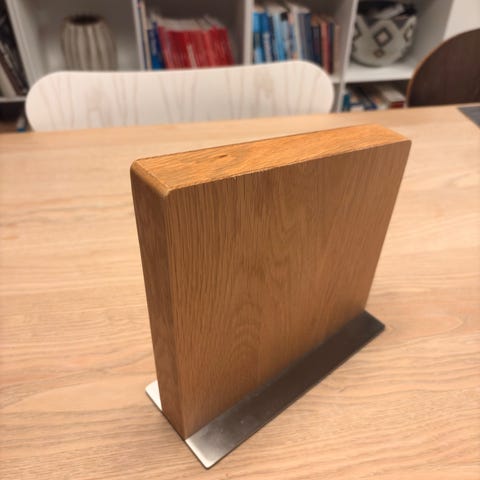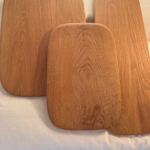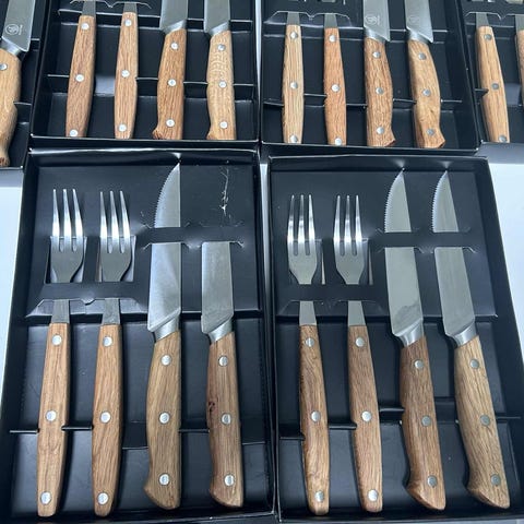 Kokkekniv og stegegaffel. Rustfrit stål/eg. Helt nyt i original æske.