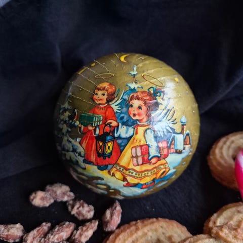 Fin antik Candy container med oblater af man in the Moon. Flot kantet med antik dresdner bort. Diameter 9 cm. Flot brugt stand
