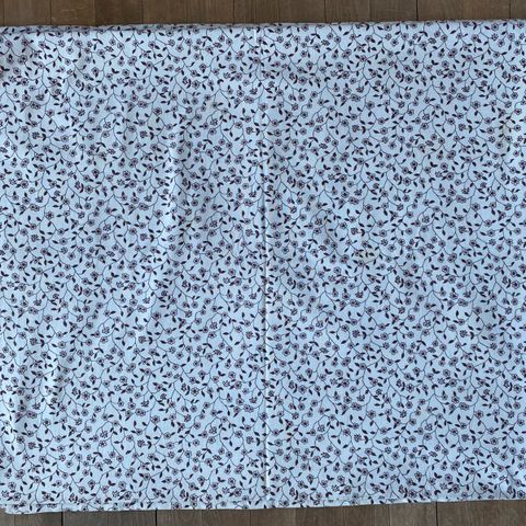 Vintage, lyseblå, lang dug med skønt stoftryk. Sort og mørkere blå blomstermønster ned langs midten. Lagt op med blå tråd syet i zig zag.