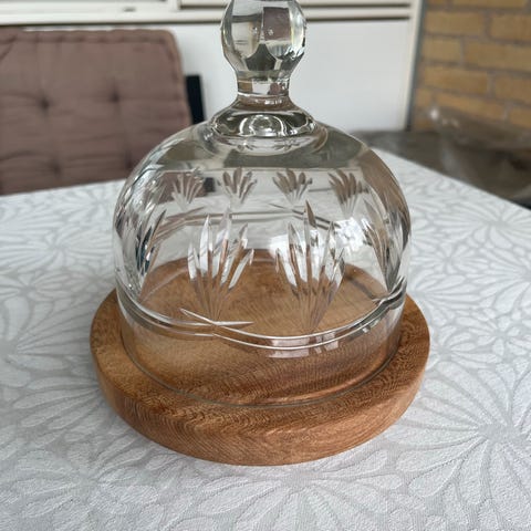 Fajance og teaktræsbund. Ø 13. Har aldersreleteret krakelering ( nærmest uundgåligt, pris sat derefter) har en underliggende ( under glasur) revne og den ses kun når den er våd og det er fordi kanten forneden er uglaseret ( lavet sådan) se billederne. Sender gerne og pakker altid godt ind.