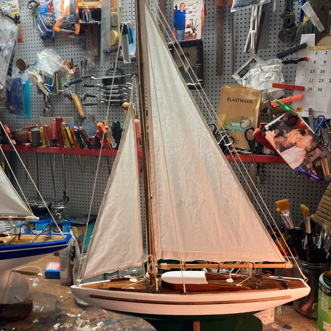 Meget smuk,antik, bygget til sejlads med metal-køl. Mål 85x85x15 cm.