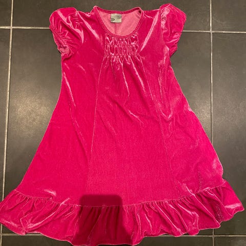 Kjole, Velourkjole, festkjoler 104, Name it, str. 104, Super sød pige kjole 2 delt i tekstil. Overdel rosa velour. Underdel bomulsdshør af trætvævet tråde af guldglimmer matchende rosa tråd blandet imellem. Svarer til 3-4 år