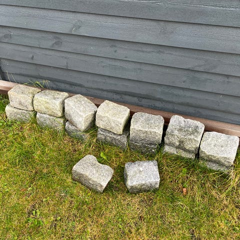 Flotte brosten fra hestestald. Ca. 20x20cm stolpesten med hul/fordybning i midten. Hugget i naturstien, 19styk i alt.