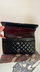 Chanel Classic Flap taske i sort læder med sølv hardware.