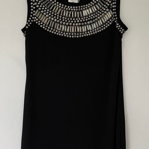 Sort kjole med sort perlemønster foran, med lille jakke i sort/hvid. Kjole i str. M og jakke str. 38. I alt kr. 750.
