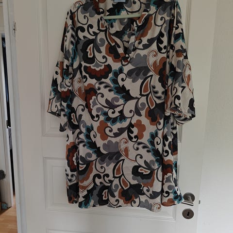Mønstret sort/grøn tunika fra ZHENZI str. XXL - 3/4 lange 'løse' ærmer - V hals - 2 skrålommer foran - den er løstsiddende, men selve stoffet er ikke tyndt stof og den er lige en anelse længere bagtil end foran.