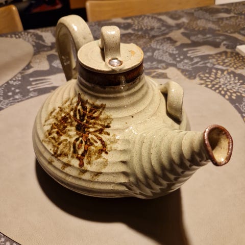 Keramik, Edith Nielsen, Tekande, Smuk tekande / tepotte af keramiker Edith Nielsen. H 15 cm ex hank. Svage krakeleringer i glasuren, et lillebitte afslag på tuden.