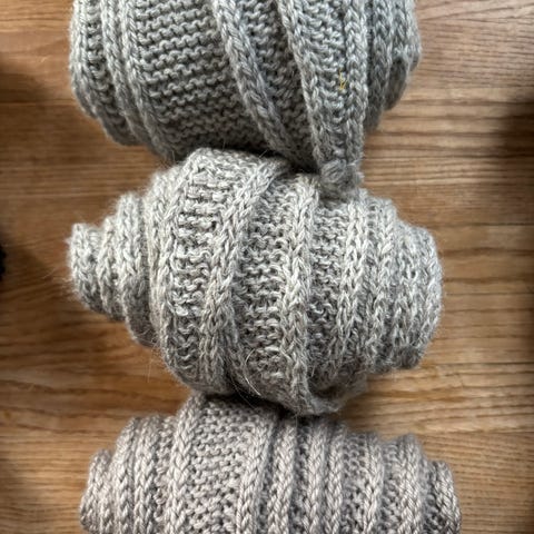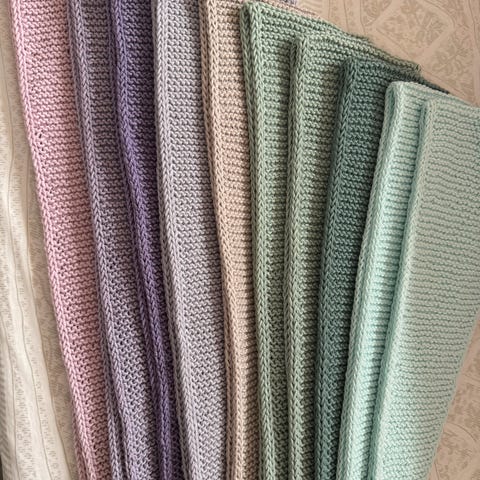 Tørklæder i lidt forskellige længder. Kan alle nå to gange rundt om halsen, så det er et spørgsmål om hvor lange snipper man ønsker. Ca 106- 120 cm. Udgangspunktet er Sophie Scaff fra Petit knit. Forskellige garner, men alle i uld eller uldblandinger. 130,- stk. Gratis fragt ved køb af 3 stk.