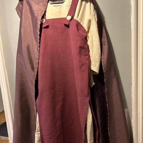 Str. XL munkedragt m. Hætte udklædning med rebbælte og kors halskæde. Går op i syningen i venstre side nederst, men egentligt uden betydning. Hvis jeg skal sy den koster den 150kr og hvis du selv vil sy den eller lade være så 120 kr.