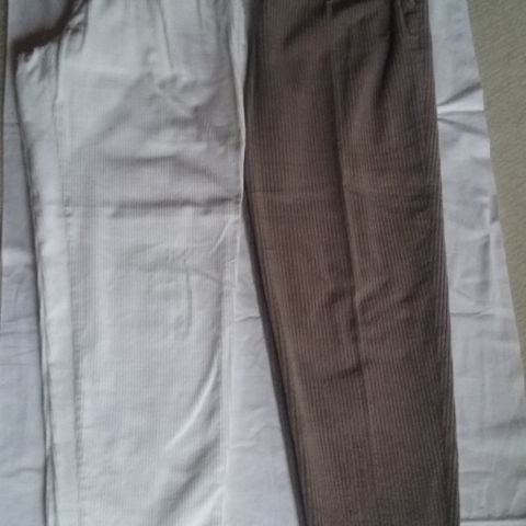 2 par pæne damebukser str 40 i fløjl med læg foran og sidelommer livvidde ca 76 cm - et par lækre brune bukser fra Brandtex med sidelommer og et par hvide bukser fra Estelle, ligeledes i fløjl og med sidelommer. Begge par har 3 læg i hver side foran. Pris pr par kr 125,-.