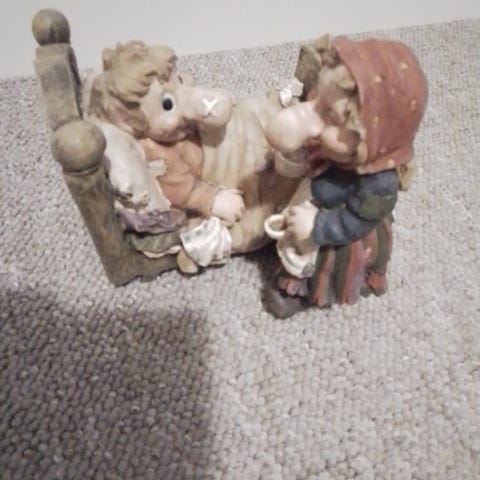 Daelles vintage træ figur -Nisse og trold med skind hår og skæg.