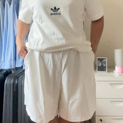 Adidas Originals cargo pants i lyserød/grå camoflage. Fede bukser med 5 lommer. Har nogle meget små og næsten usynlige pletter nederst bag på begge bukseben, der er markeret på næstsidste billede. Størrelsen er EU 42, hvilket i Adidas er Large - se evt. sidste billede for Adidas’ egne størrelsesdetaljer.