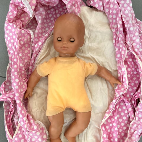 Fin flettet retro lift til dukke. Den er fra 70'erne, har en lile fejl ved det ene håndtage, og den er gået i stykker 3 steder i fletten, se billed. Det kan nemt syes. Ellers ser den ud som ny, ingen pletter. Mål 26 cm x 44 cm