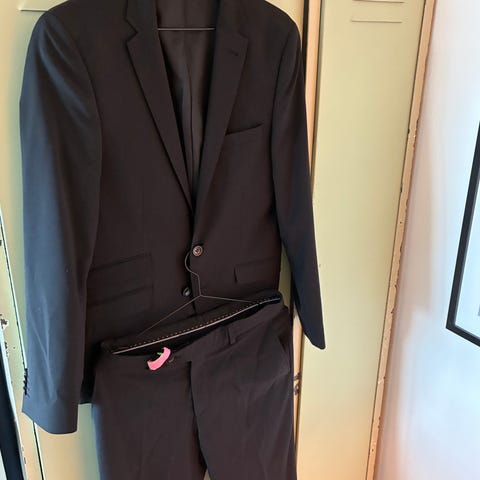 Sort jakkesæt til drenge i størrelse M, bestående af jakke, vest og bukser. Sættet har en klassisk pasform og har været brugt til konfirmation.