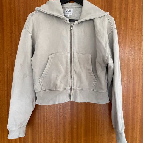 Meget sød og pyntet bluse med laksefarvet lynlås, i grå jersey med ærmer i ‘lys laksefarve’.