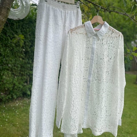Elegant lyst sæt str. 42 af mærket Claire.dk. 49% bomuld, 44% polyamid og 7% polyester.