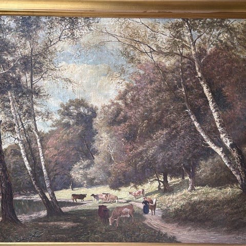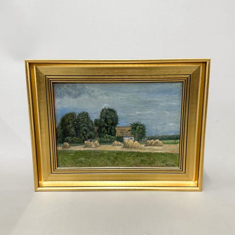 Smukt landskabsmaleri af danske marker med gårde i baggrunden.