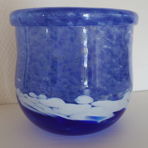 Flot ældre mørkeblå glas urtepotteskjuler fra Lyngby glas med mærkat. Diameter top 17 cm. Højde 16 cm.