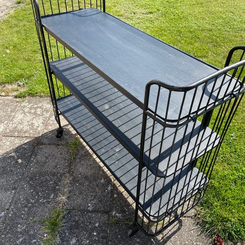 Ca 1 meter bred og forholdsvis tung. Den stabiliseres alt efter hvor tunge tingene er ovenpå.