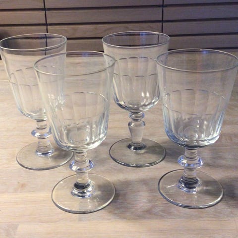 4 nøgen jomfru glas med hul stilk, let grålig glas.