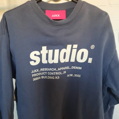 Mørkeblå sweatshirt med sort skind stribe fra armhule og ned i begge sider i str S
