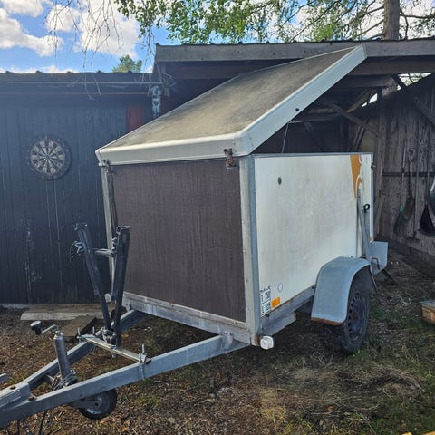 Overdelen befæstes solidt i ti hængsler og i fem transport bundbeslag. Til Variant trailer serie 1306 årg. 2020, muligvis også til andre Variant trailer med samme ladmål/hængselafstand. Pris ide´ 9500,- gi´ et bud :-)
