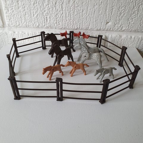 I god stand. Det er en ponyranch med heste og figurer. Du får alt, hvad du ser på billederne. Tilstanden kan ses på billederne. Send mig en mail, hvis du har spørgsmål.