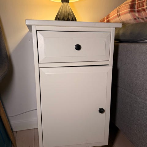 To stk. skønne sengeborde hvidmalet med Jotun. Trænger til en kærlig hånd (den ene skuffe skal repareres), men man kan hurtigt lave dem helt fine igen.