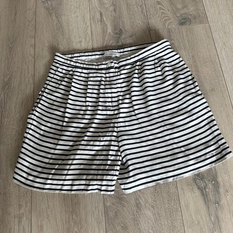 Flotte fest shorts i varm brun farve med små røde striber. Med læg og skrålommer. Snydelommer bagpå. Med plads til bælte. Totallængde 57 cm. Størrelse L og svarer ca. til str. 38. Meget fine og helt intakte.