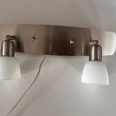 Drejelige lampetter med hver sin lysdæmper, rustfri stål med hvide glasskærme. 2x40 w.