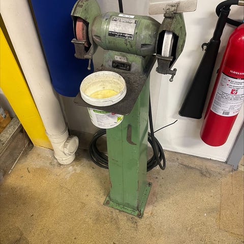 Slibesten. Ca 16 cm i dia, 3,5 cm høj, 2,5 cm i midten.
