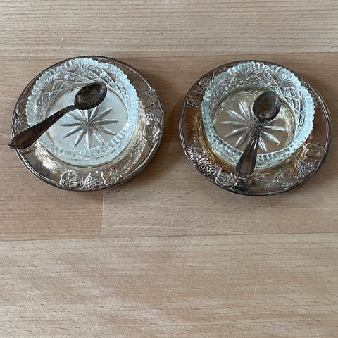 Fint lille saltkar med blå glasindsats. Jeg gætter på, at det er pletsølv (eller forsølvet), men sødt ser det ud. Der er en mørk fejl på bagsiden dog. Den medfølgende lille ske er til gengæld (925) sølv med mærke bagpå. Skeen er ca. 7 cm lang; saltkarret knapt 6 cm.