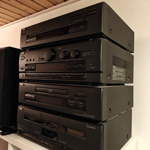 Det har indbygget tuner i forstærkeren, 3 CD skifter, Tape/kassette afspiller (som pt er defekt)