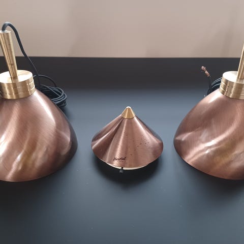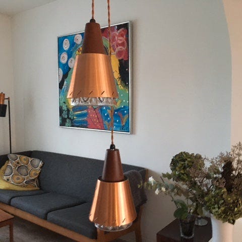 Flotte reto kobber lamper 3 styk , for 500 kr med gl porcelæn fatning , virker.