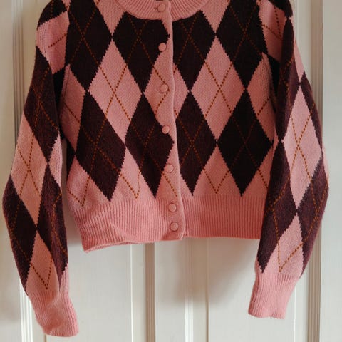 Har v-hals og lukkes med små røde knapper i samme farve.