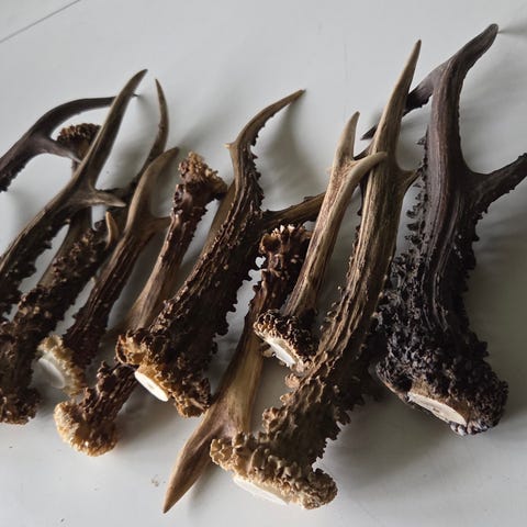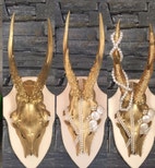 Opsats bestående af rådyrgevirer og rådyrkranier i forskellige størrelser og farver. Materialet er naturlige rådyrgevirer og kranier,.