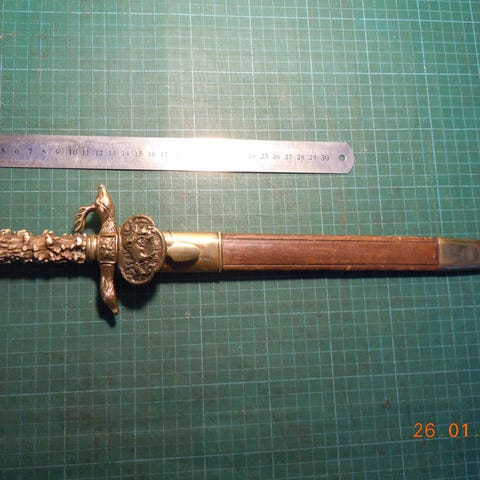Stilet / Dolk med med lang smal klinge, messingbeslag og rosentræsskæfte. Ikke mærket, Aldrig slebet på. Ukendt type. Virker gedigen. Blankvåbentilladelse kræves.
