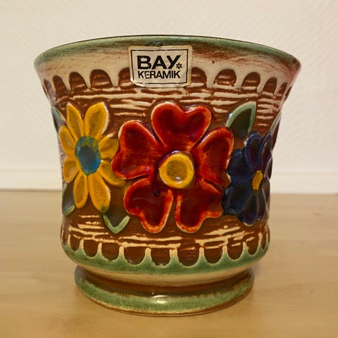 Så retro - Tysk Bay Keramik orange urtepotteskjuler. Højde ca. 11,5 - diameter ca 13 cm. 2 små chip på kanten - ses på billederne.