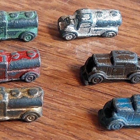 Fremstår med brugsspor og slitage på kasse og metalbrikkerne er i blandet stand med aldersrelateret forvitring.