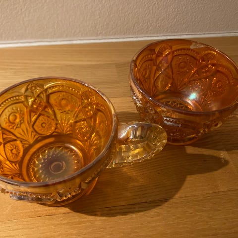 Fem kopper i glas med hank. H 9 cm. Sælges samlet for 125kr. Kan hentes i Hillerød øst (fleksibel afhentning) eller Nordhavn (kontorstid) ved aftale. Sender ikke.